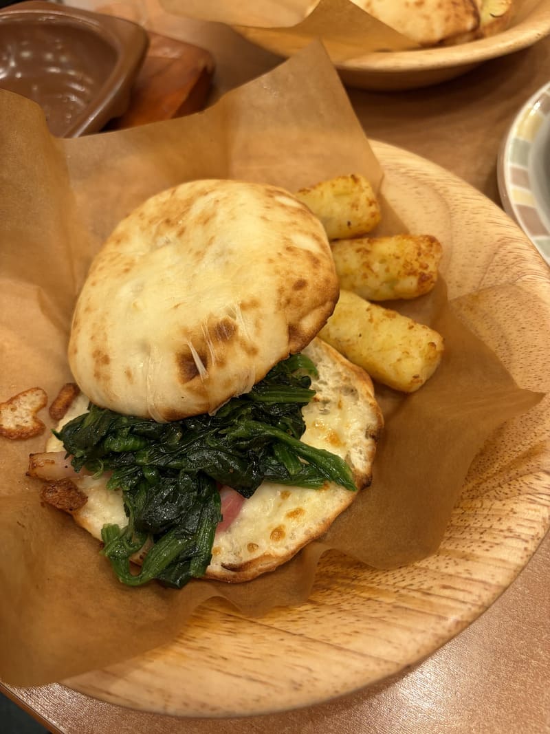 私は「パンチェッタとチーズのパニーニ」にほうれん草のソテーをサンド。